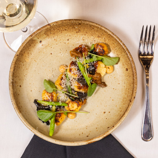 Appetizer: Hand Rolled Potato Gnocchi served with spring onion, wild mushroom, aparagus grana padano, and preserved meyer lemon.