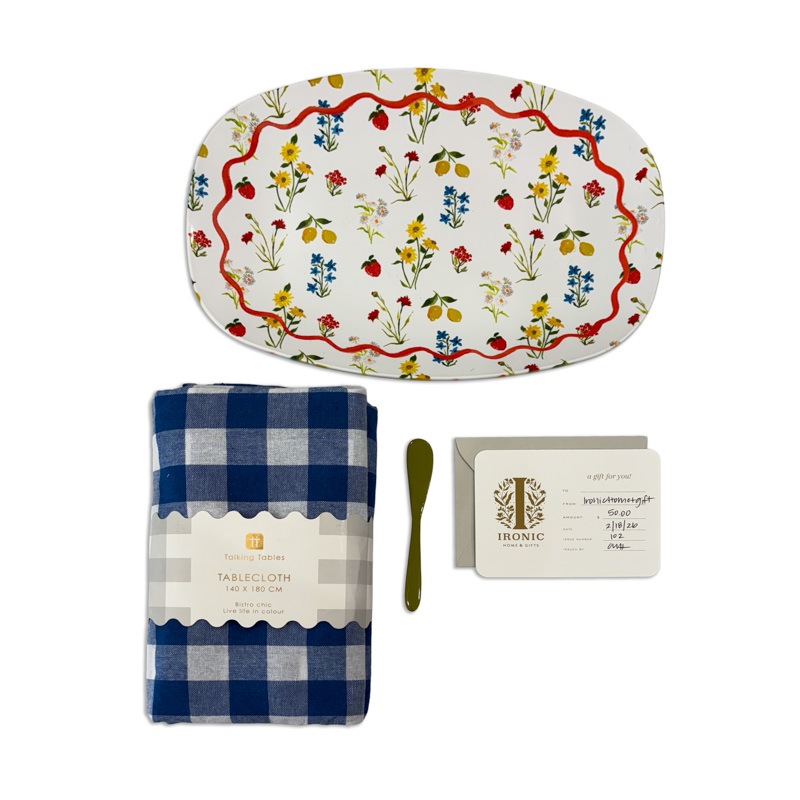 Add character and charm to your home with this $50 gift card to Ironic, paired with a curated set of home accents, including a platter, dish towel, and butter knife. Specializing in iron decor, seasonal pieces, game-day signs, and holiday accents, Ironic offers a little bit of everything for unique, stylish touches throughout your home.